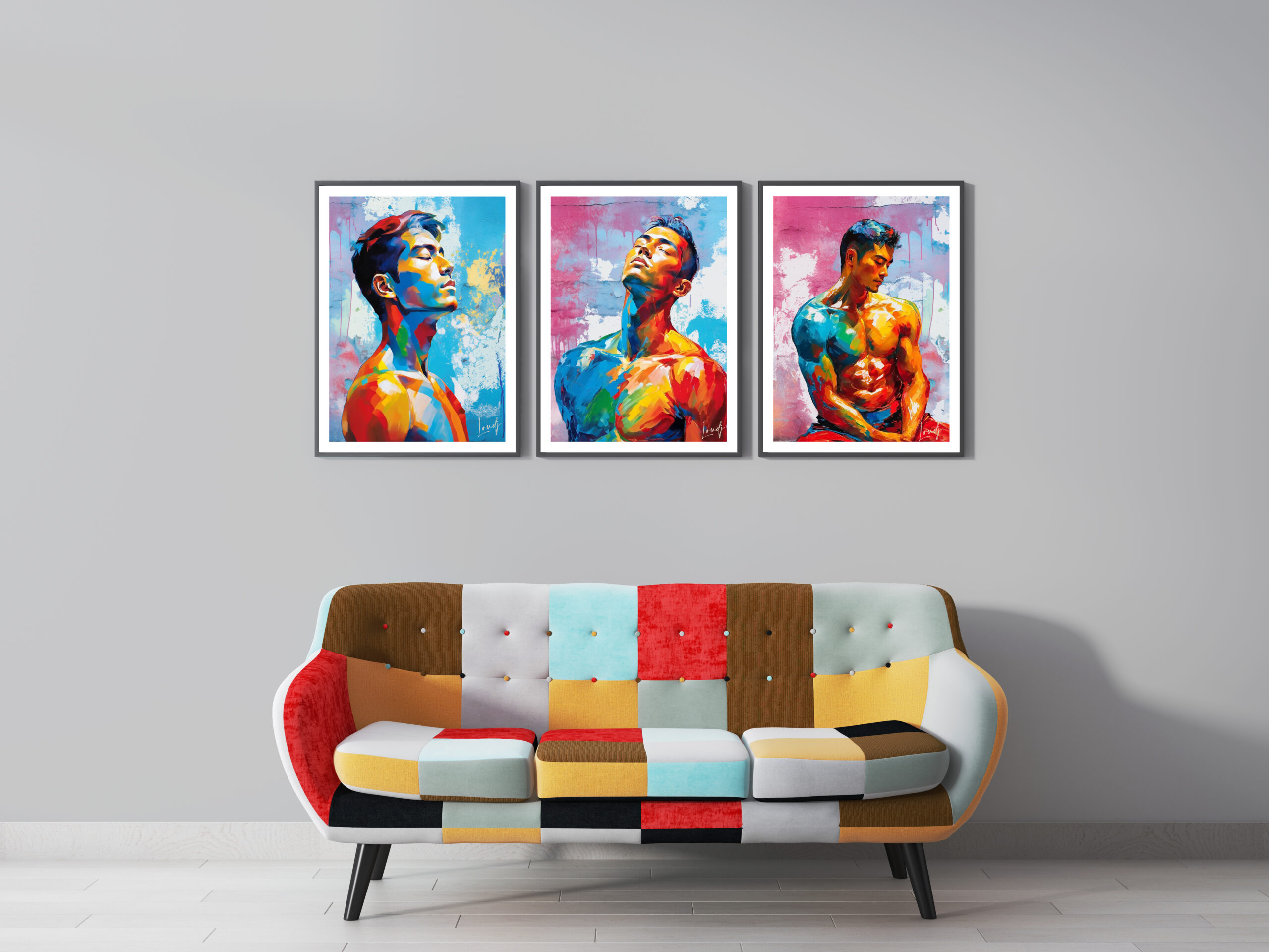 Plongez dans l’univers unique de cette affiche d’art contemporain, représentant un homme sensuel coloré, sublimé par la technique de la peinture à l’huile sur fond en béton brut, avec coulures de peinture vives